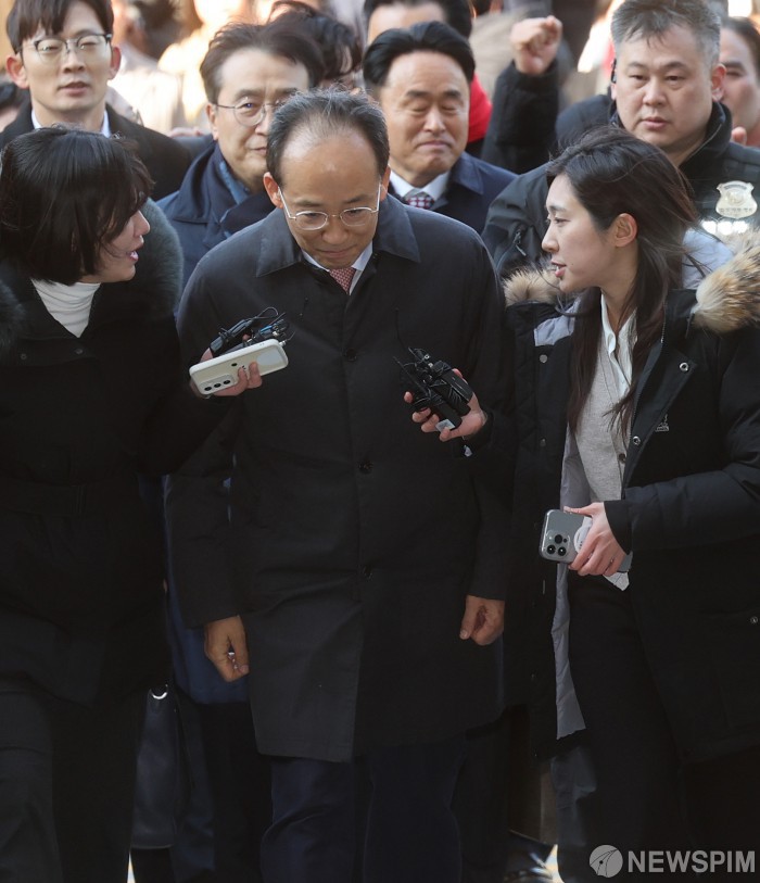 [서울=뉴스핌] 최지환 기자 = 국회의 12·3 비상계엄 해제 의결 방해 의혹을 받는 추경호 전 국민의힘 원내대표가 2일 오후 서울 서초구 서울중앙지방법원에서 열린 영장실질심사(구속 전 피의자 심문)에 출석하고 있다. 2025.12.02 choipix16@newspim.com