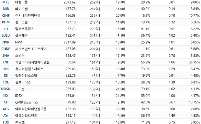 그래서 샤르마 회장이 제시한 원칙을 바탕으로 금융정보 플랫폼 코이핀을 활용해 직접 종목을 추려(관련 내용은 표 참고)봤다. ①시총 100억달러 이상 ②PER(포워드) 22배 이하(S&P500 1일 22.6배) ③최근 3개 회계연도 평균 ROE 15% 초과 ④총부채비율 100% 이하(최근 회계연도 말 기준) 등이다.