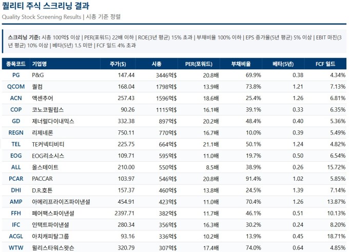 총 35개 종목이 나왔다. ③⑤⑥은 스크리닝 조건으로 적용하되 표에는 표기하지 않았다. 시가총액 상위 기준으로 프록터앤드갬블(PG), 퀄컴(QCOM), 액센추어(ACN), 코노코필립스(ACN), 제너럴다이내믹스(GD), 리제네론(REGN), TE커넥티비티(TEL), EOG리소시스(EOG), 올스테이트(ALL), PACCR(PCAR) 등이다.