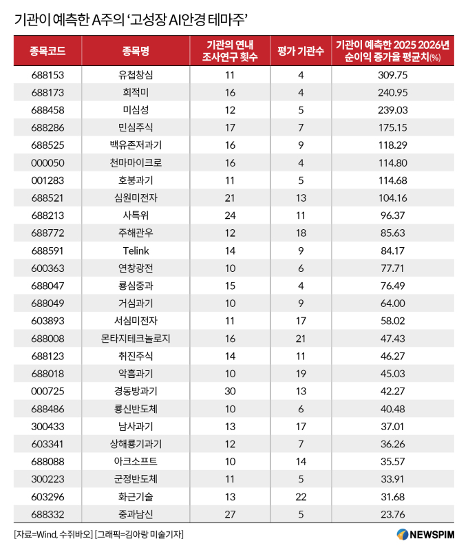이 가운데 기관으로부터 3회 이상의 평가를 받은 동시에, 기관이 예측한 2025년과 2026년 순이익 증가율 평균치가 20% 이상인 종목을 선별한 결과 26개로 압축됐다.