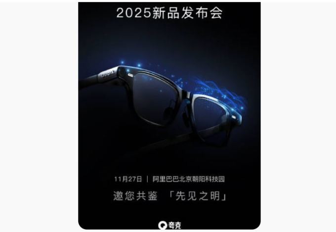 | [사진 = 알리바바 콰크 공식 웨이보] 알리바바가 11월 27일 '2025년 신제품 발표회'를 개최하고 자체 개발한 최초의 플래그십 듀얼 디스플레이 AI 글래스 '콰크(誇克∙QUARK) S1'을 정식으로 공개할 예정이라고 밝혔다. |
