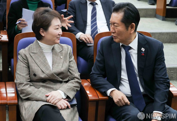 [서울=뉴스핌] 윤창빈 기자 = 정청래 더불어민주당 대표, 이언주 의원이 2일 서울 여의도 국회에서 열린 의원총회에서 대화를 하고 있다. 2025.12.02 pangbin@newspim.com