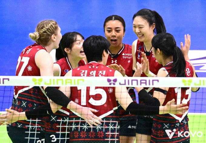 | 현대건설 선수들이 2일 V리그 여자부 GS칼텍스와의 홈 경기에서 득점을 올리고 함께 기쁨을 나누고 있다. [사진=KOVO] |