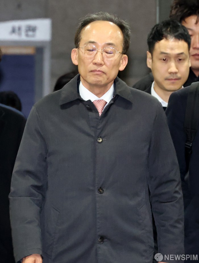 [서울=뉴스핌] 최지환 기자 = 국회의 12·3 비상계엄 해제 의결 방해 의혹을 받는 추경호 전 국민의힘 원내대표가 3일 새벽 서울 서초구 서울중앙지방법원에서 열린 영장실질심사(구속 전 피의자 심문)를 마치고 법정을 나서고 있다. 2025.12.03 choipix16@newspim.com