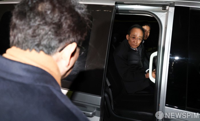 [서울=뉴스핌] 최지환 기자 = 국회의 12·3 비상계엄 해제 의결 방해 의혹을 받는 추경호 전 국민의힘 원내대표가 3일 새벽 서울 서초구 서울중앙지방법원에서 열린 영장실질심사(구속 전 피의자 심문)를 마치고 호송차량에 탑승해 있다. 2025.12.03 choipix16@newspim.com