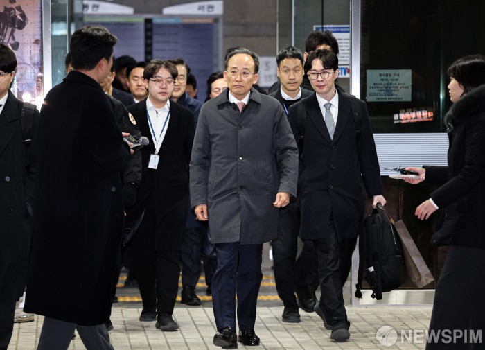 [서울=뉴스핌] 최지환 기자 = 국회의 12·3 비상계엄 해제 의결 방해 의혹을 받는 추경호 전 국민의힘 원내대표가 3일 새벽 서울 서초구 서울중앙지방법원에서 열린 영장실질심사(구속 전 피의자 심문)를 마치고 법정을 나서고 있다. 2025.12.03 choipix16@newspim.com