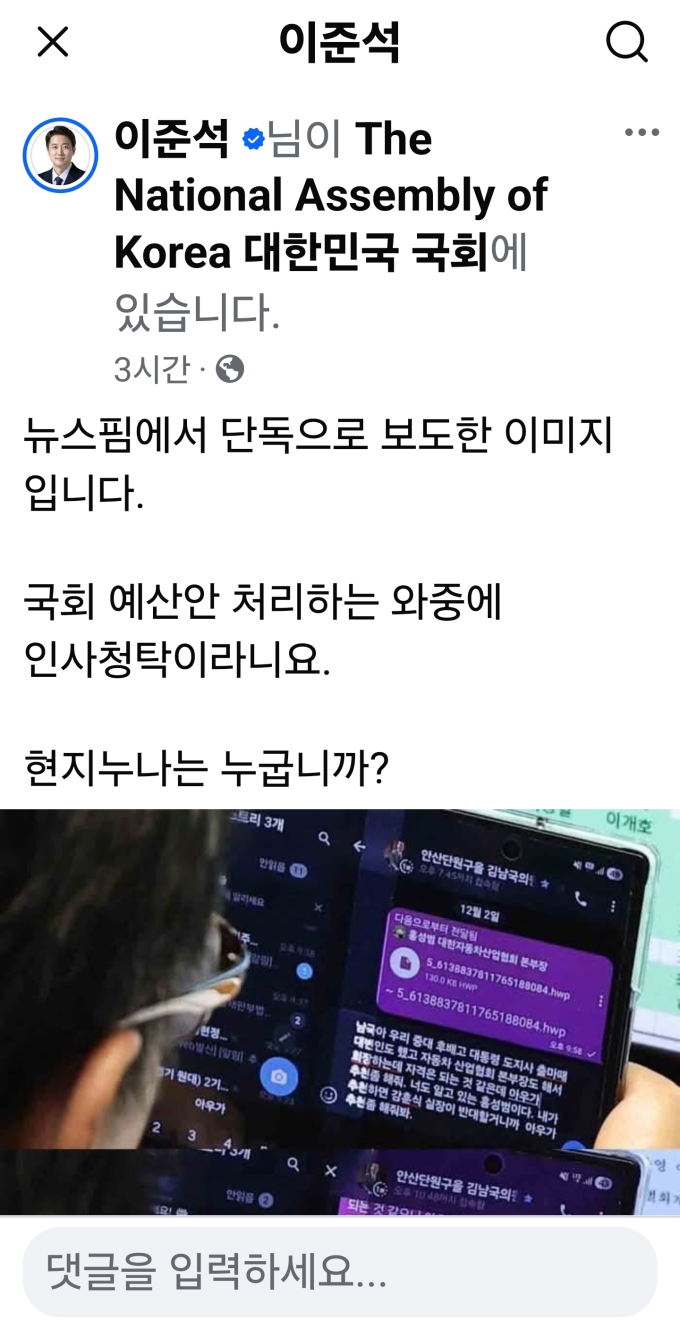 이준석 개혁신당 대표도 페이스북에 뉴스핌 단독 기사를 공유하며 "국회 예산안 처리하는 와중에 인사청탁이라니요. 현지 누나는 누굽니까"라고 비판했다.