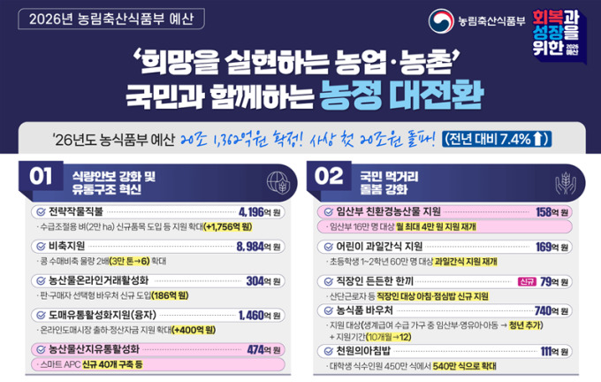 [2026 예산] 농식품부 20.1조 확정…농어촌 기본소득 637억 증액
