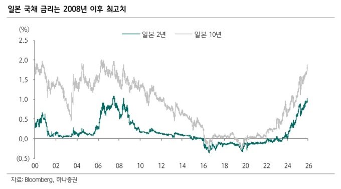 허성우 연구원은 "일본 2년물과 10년물 국채 금리는 각각 약 1%와 1.8%대 후반까지 올라 2008년 이후 최고 수준을 기록 중"이라며 "특히 통상 BOJ 정책 변화에 민감한 2년물이 1%를 넘긴 것은 금융위기 이후 처음으로, 시장이 단기 내 추가 인상을 거의 기정사실로 받아들이고 있다는 방증으로 해석된다"고 밝혔다. ​​