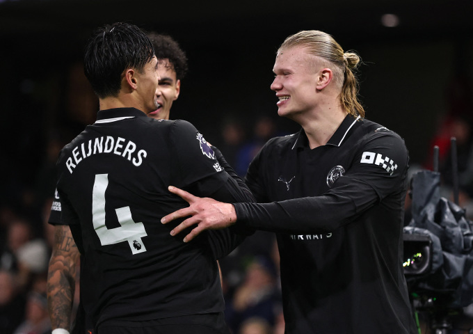 | [런던 로이터=뉴스핌] 장환수 스포츠전문기자= 맨체스터 시티 엘링 홀란(오른쪽)이 3일 풀럼 원정에서 전반 37분 티자니 라인더르스의 골을 어시스트한 뒤 기쁨을 나누고 있다. 2025.12.03 zangpabo@newspim.com |