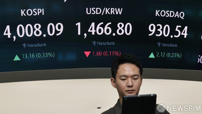 [서울=뉴스핌] 양윤모 기자 = 3일 오전 코스피가 전장 종가보다 13.16 포인트(0.33%) 상승하며 4008.09로, 코스닥은 2.12 포인트(0.23%) 상승한 930.54로 장을 시작한 가운데, 서울 중구 하나은행 딜링룸에서 직원들이 업무를 보고 있다. 서울외환시장에서 달러/원 환율은 전장 대비 1.60원 하락한 1466.80원에 주간거래를 시작했다. 2025.12.03 yym58@newspim.com