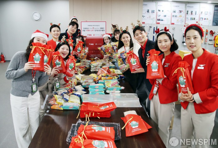 [서울=뉴스핌] 지난 2일 티웨이항공 훈련센터에서 진행된 '티웨이 산타' 행사 준비에서 티웨이항공 임직원 봉사자들이 아동·청소년들에게 전달할 연말 선물 키트를 포장하고 있다. [사진=티웨이항공] 2025.12.03 photo@newspim.com