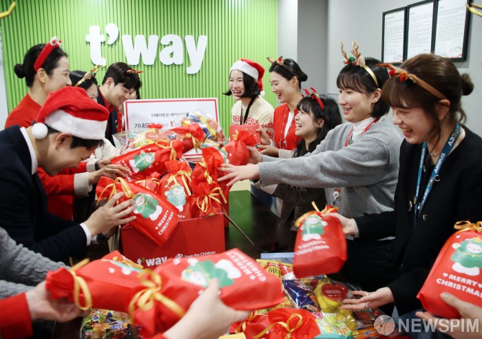 [서울=뉴스핌] 지난 2일 티웨이항공 훈련센터에서 진행된 '티웨이 산타' 행사 준비에서 티웨이항공 임직원 봉사자들이 아동·청소년들에게 전달할 연말 선물 키트를 포장하고 있다. [사진=티웨이항공] 2025.12.03 photo@newspim.com