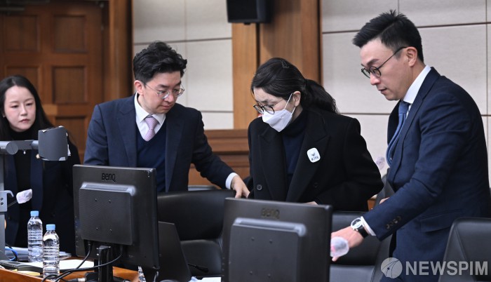 [서울=뉴스핌] 사진공동취재단 = 도이치모터스 주가조작과 명태균 공천개입, 통일교 청탁·뇌물 수수 의혹 혐의 등으로 구속기소 된 김건희 여사가 3일 서울 서초구 서울중앙지방법원에서 열린 자본시장법 위반 혐의 결심 공판에 출석하고 있다. 2025.12.03 photo@newspim.com