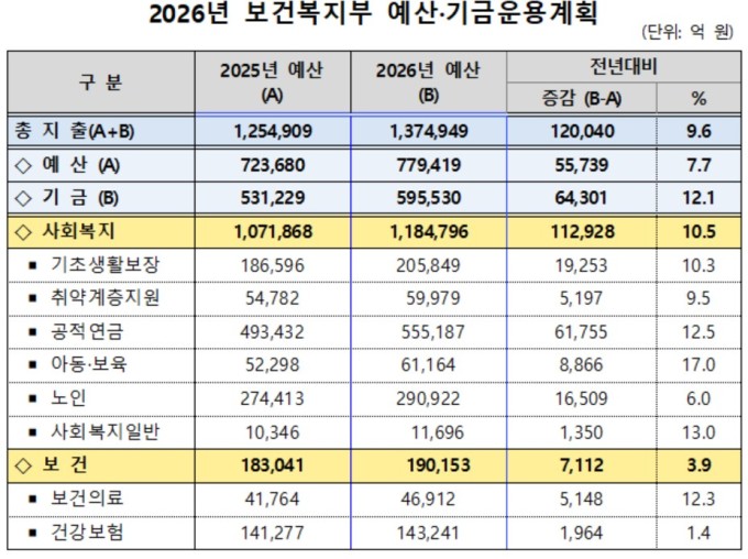 복지부는 국회 의결을 거쳐 2026년도 보건복지부 예산 및 기금운용계획의 총지출 규모가 올해(125조4909억원) 대비 12조40억원(9.6%) 늘어 137조4949억원으로 확정됐다고 3일 밝혔다.