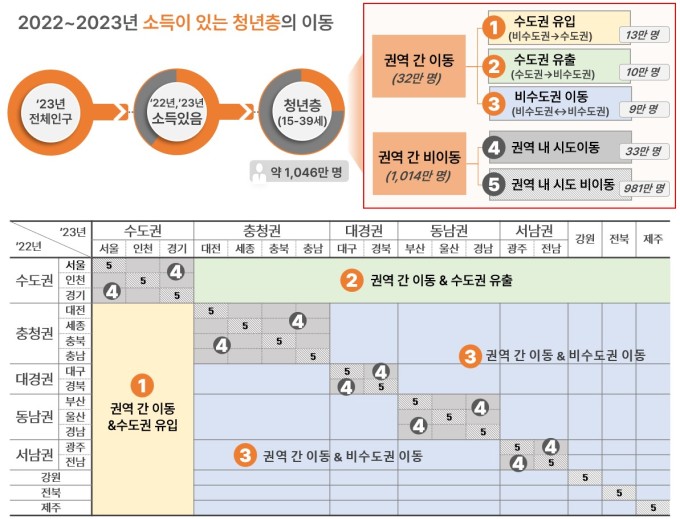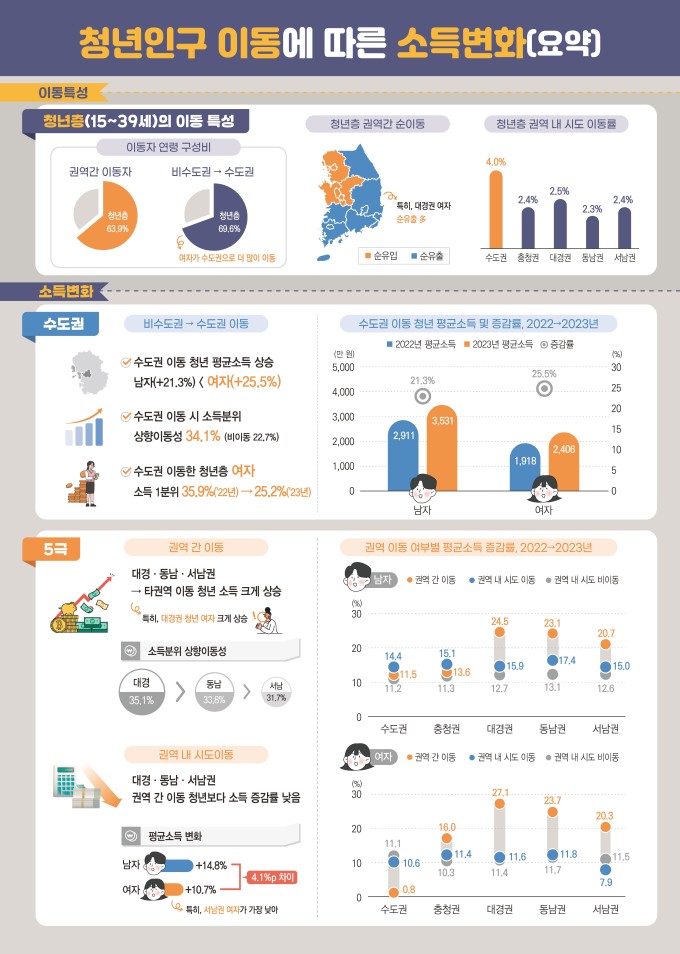 권역별로 보면 대경권(대구·경북)에서 이동한 청년의 소득증가율이 25.4%로 가장 높았고, 동남권(부산·울산·경남) 23.3%, 서남권(광주·전남) 20.5% 순이었다.