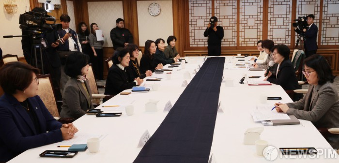 [서울=뉴스핌] 이길동 기자= 원민경 성평등가족부 장관이 3일 서울 종로구 정부서울청사에서 열린 금융분야 여성 임원 현장 소통 간담회에서 인사말을 하고있다.2025.12.03 gdlee@newspim.com
