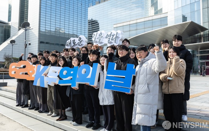 [서울=뉴스핌] 법정기념일인 '무역의 날' 62주년을 앞두고 서울 강남구 코엑스 광장에서 한국무역협회 직원들이 올해 슬로건인 "K-무역, 새로운 길을 열다"를 들고 기념촬영을 하고 있다. [사진=한국무역협회] 2025.12.03 photo@newspim.com