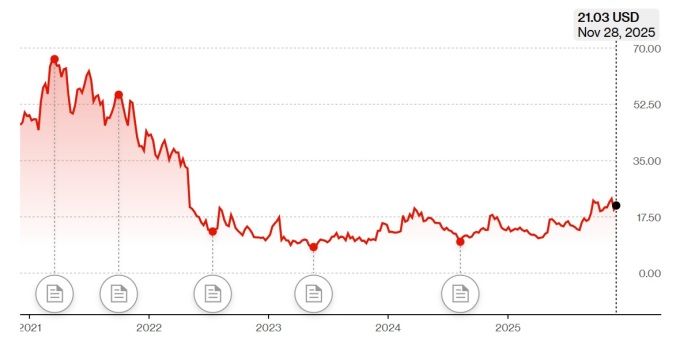 업체의 주가는 기업공개(IPO) 직후 78달러 선까지 올랐을 뿐 추세적인 하락을 지속했고, 2023년 5월에는 10달러 아래로 떨어지기도 했다.