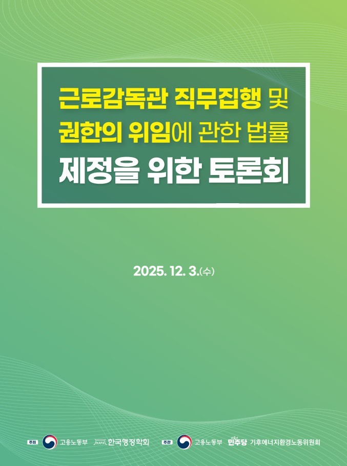 고용노동부는 3일 서울고용노동청에서 '근로감독관 직무집행 및 권한의 위힘에 관한 법률'(근로감독관 직무집행법) 제정을 위한 토론회를 열었다고 밝혔다. 현장은 노동부가 국회 기후에너지환경노동위원회 소속 더불어민주당 의원들과 공동 주최해 마련됐다. 앞서 김주영 민주당 의원은 지난달 5일 근로감독관 직무집행법을 발의한 바 있다.