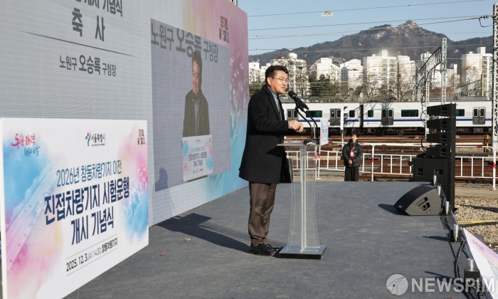 [서울=뉴스핌] 양윤모 기자 = 오승록 노원구청장이 3일 오후 서울 노원구 노원로 573번지 창동차량기지에서 개최된 2026년 창동차량기지 이전에 따른 '진접차량기지 시험운행 개시 기념식'에 참석해 축사를 하고 있다. 진접차량기지는 2018년 착공해 지난 11월부터 종합 시험 운행 중이며, 진접으로 이동하는 창동차량기지 일대는 2028년 착공을 목표로 '강북권 대개조-강북 전성시대' 사업의 핵심인 서울디지털바이오시티(S-DBC)가 들어선다. 2025.12.03 yym58@newspim.com
