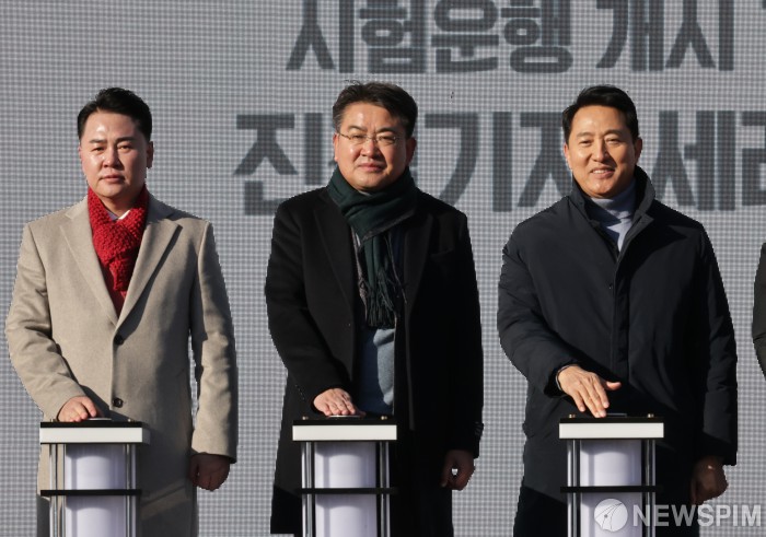 [서울=뉴스핌] 양윤모 기자 = 3일 오후 노원구 노원로 573번지 창동차량기지에서 개최된 '진접차량기지 시험운행 개시 기념식'에 참석한 오세훈 서울시장과 오승록 노원구청장,오언석 도봉구청장이 기념촬영을 하고 있다. 진접으로 이동하는 창동차량기지 일대는 2028년 착공을 목표로 '강북권 대개조-강북 전성시대' 사업의 핵심인 서울디지털바이오시티(S-DBC)가 들어선다. 2025.12.03 yym58@newspim.com