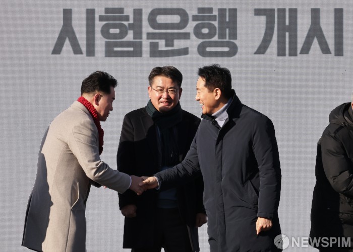 [서울=뉴스핌] 양윤모 기자 = 3일 오후 노원구 노원로 573번지 창동차량기지에서 개최된 '진접차량기지 시험운행 개시 기념식'에 참석한 오세훈 서울시장과 오승록 노원구청장,오언석 도봉구청장이 행사를 마치고 악수하고 있다.진접으로 이동하는 창동차량기지 일대는 2028년 착공을 목표로 '강북권 대개조-강북 전성시대' 사업의 핵심인 서울디지털바이오시티(S-DBC)가 들어선다. 2025.12.03 yym58@newspim.com