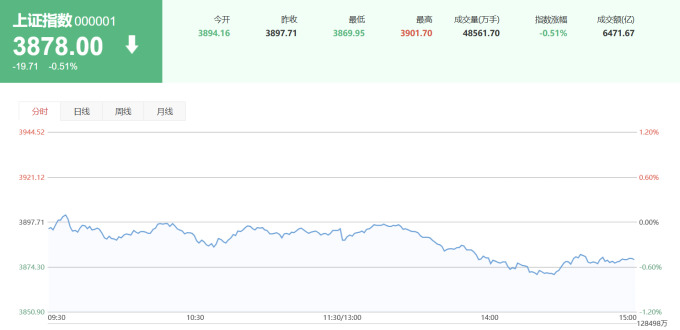 상하이종합지수 3878.00(-19.71, -0.51%)