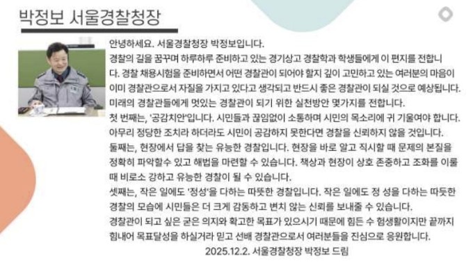 박정보 서울경찰청장의 메시지. [사진=서울시교육청]