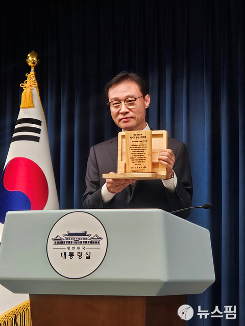 [서울=뉴스핌] 박찬제 기자 = 이규연 대통령실 홍보소통수석이 3일 이재명 대통령이 우원식 국회의장으로부터 받은 빛의 혁명 1주년 기념패를 들고 있다. 2025.12.03 pcjay@newspim.com