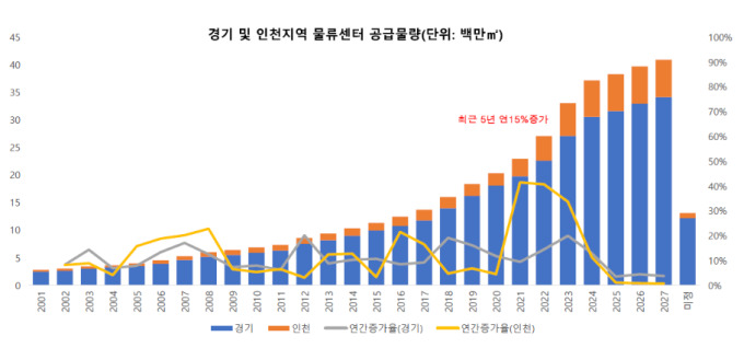 물류센터 시장은 공급이 급감하면서 공실률이 완만한 속도로 개선될 것으로 예상된다. 지난해 수도권 신규 공급이 397만㎡에 달했으나 올해부터 2027년까지 연평균 공급량은 122만㎡ 수준으로 줄어드는 것으로 조사됐다. 최근 5년간 재고가 연평균 15%씩 불어난 것과 비교하면 공급 사이클이 급격하게 식는 셈이다.