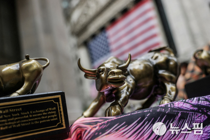 | 뉴욕증권거래소(N)YSE)를 배경으로 강세장을 의미하는 황소상 모형이 보인다.[사진=로이터 뉴스핌] 2025.12.04 mj72284@newspim.com |