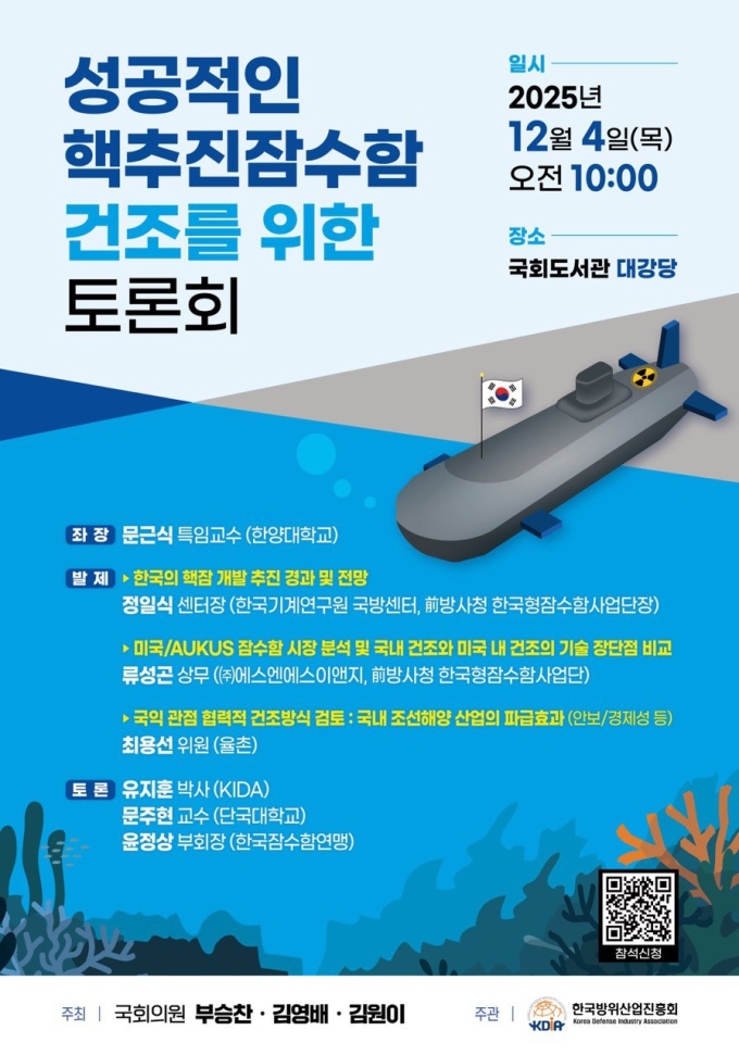 [서울=뉴스핌] 정태선 기자 =여당 국회의원이 주최한 첫 핵추진 잠수함(핵잠) 관련 세미나가 국회에서 열리며 한국형 핵잠 건조의 향후 방향을 둘러싼 논의가 본격화됐다.