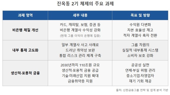 우선 신용카드, 캐피탈, 보험, 증권 등 비은행 계열사의 수익 안전성을 통해 국내 리딩 금융그룹으로의 위상을 분명히 하는 것이 필요하다. 현재 그룹 이익의 상당 부분이 은행에 치우쳐 있어 수익원 다변화가 최우선 과제로 꼽히고 있다. 특히 적자를 내온 일부 비은행 계열사의 체질 개선과 자본 효율성 제고는 진옥동 2기의 핵심 과제로 꼽힌다.