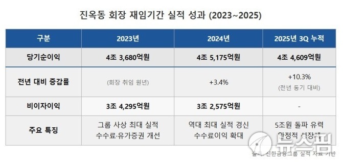 이 같은 실적 행진은 2025년에도 이어졌다. 신한금융그룹의 3분기 누적 당기순이익은 4조4609억원으로 전년 동기 대비 10.3% 증가했으며, 연간을 기준으로 하면 5조원 돌파가 유력한 상황이다. 재임 기간 사상 최대 실적을 연이어 경신한 것이다.