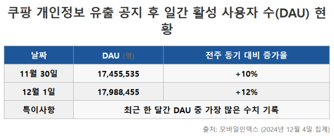 4일 시장조사 업체 모바일인덱스 집계에 따르면 쿠팡이 약 3,370만 건의 개인정보 유출 사실을 공지한 지난달 29일 이후인 30일과 이달 1일 쿠팡 일간 활성 사용자 수(DAU)는 각각 1,745만 5,535명, 1,798만 8,455명을 기록했다. 이는 전주 동기 대비 각각 10%, 12% 증가한 수치이며, 최근 한 달간 DAU 중 가장 많은 수치였다.