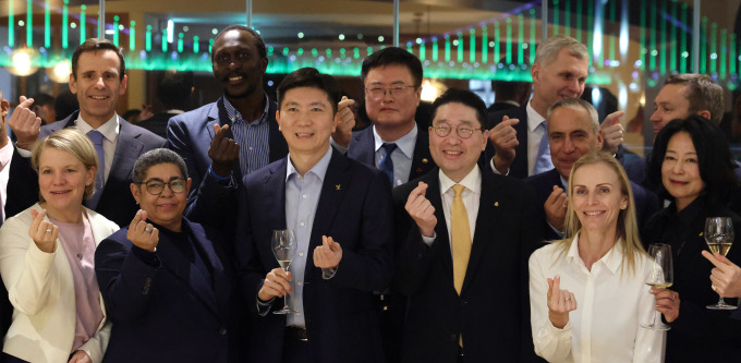 | [서울=뉴스핌] 김대현 문화체육관광부 제2차관과 유승민 대한체육회장이 4일 세계도핑방지기구(WADA) 총회가 열리고 있는 부산의 한 식당에서 국제올림픽위원회(IOC) 위원 만찬 행사를 열고 참석자와 기념촬영을 하고 있다. [사진 = 문화체육관광부] 2025.12.04 wcn05002@newspim.com |