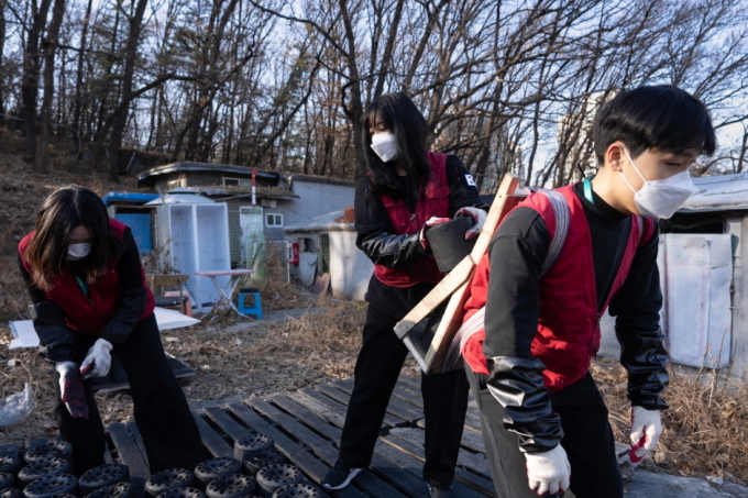 | 연탄 적재 및 운반 활동을 수행 중인 한국후지필름BI 신입사원들[사진=한국후지필름비즈니스이노베이션 제공] |