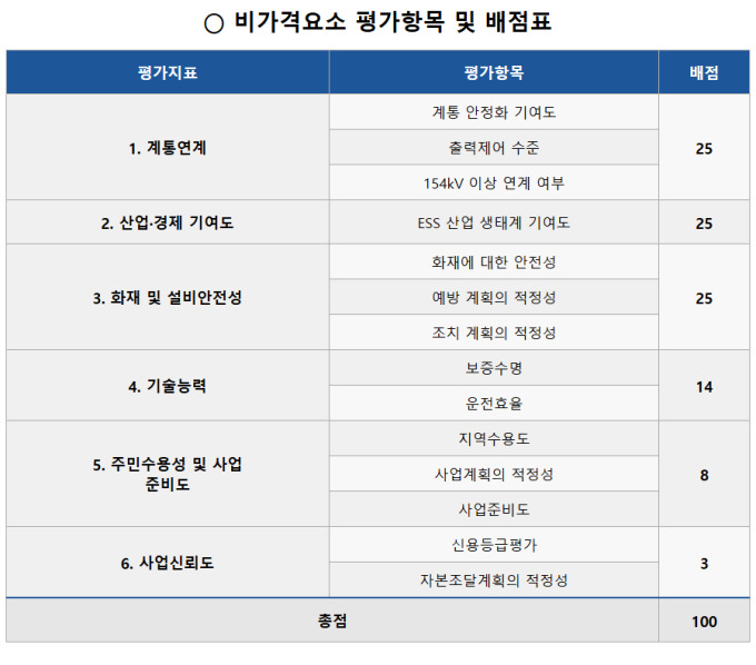 이번 2차 사업은 가격·비가격(안전성) 평가 비중이 5대5로 조정됐고, 화재 관련 항목의 배점이 크게 늘어나면서 기술 내재화 수준이 수주 성패를 가르는 변수로 떠올랐다. 실제 화재·설비 안전성 점수가 22점에서 25점으로 확대됐고, 이 가운데 화재 안전성 세부 항목은 6점에서 11점으로 두 배 가까이 상향됐다. 단순히 '어떤 화학계 배터리를 쓰느냐'를 넘어, 화재 발생 가능성·열전파·소화·복구까지 전 과정에서의 대응 능력을 상호 비교하는 구조다.