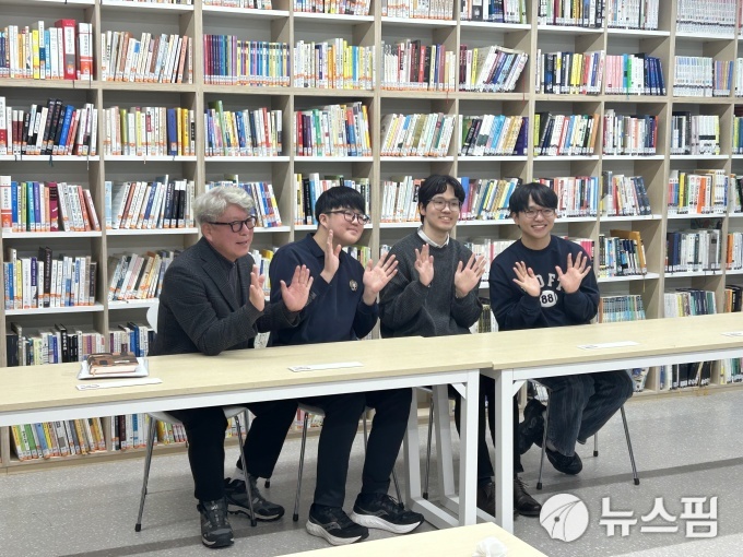 | [서울=뉴스핌] 황혜영 인턴기자 = (사진 왼쪽부터) 최재일 교장, 왕전건 군(2026학년도 수능 만점자, 고무성 교사, 서장협(2025학년도 수능 만점자) 2025.12.05 hyeng0@newspim.com |