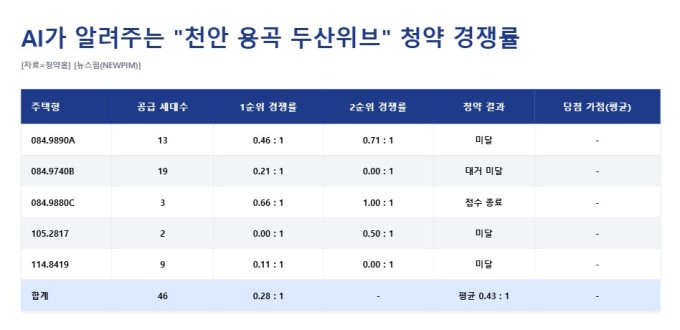 [AI 청약 리서치] '천안 용곡 두산위브' 평균 경쟁률 '0.43대 1' 고배