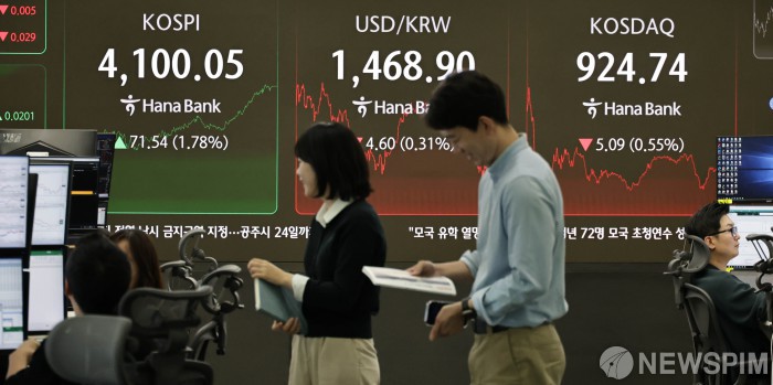 [서울=뉴스핌] 양윤모 기자 = 5일 오후 코스피가 전장 종가보다 71.54 포인트(1.78%) 상승하며 4100.05로, 코스닥은 5.09 포인트(0.55%) 하락한 924.74로 장을 마감한 가운데, 서울 중구 하나은행 딜링룸에서 직원들이 업무를 보고 있다. 서울외환시장에서 달러/원 환율은 전장 대비 4.60원 하락한 1468.90원에 주간거래를 마감했다. 2025.12.05 yym58@newspim.com