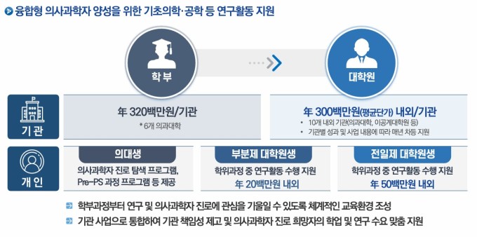 아울러 전공의 지원과 전일제 박사에 각각 지원하는 방식도 대학원으로 통합한다. 현재 지원 체계는 학부과정, 전공의 지원, 전일제 박사학위 과정이 개별적으로 지원된다. 복지부는 전공의 연구지원과 전일제 박사학위 과정 지원을 대학과정 지원으로 통합해 기관의 책임을 강화한다.