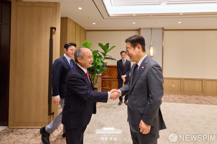 [서울=뉴스핌] 이재명 대통령이 지난 5일 서울 용산구 대통령실에서 손정의 소프트뱅크회장과 악수를 하고 있다. [사진=대통령실] 2025.12.06 photo@newspim.com