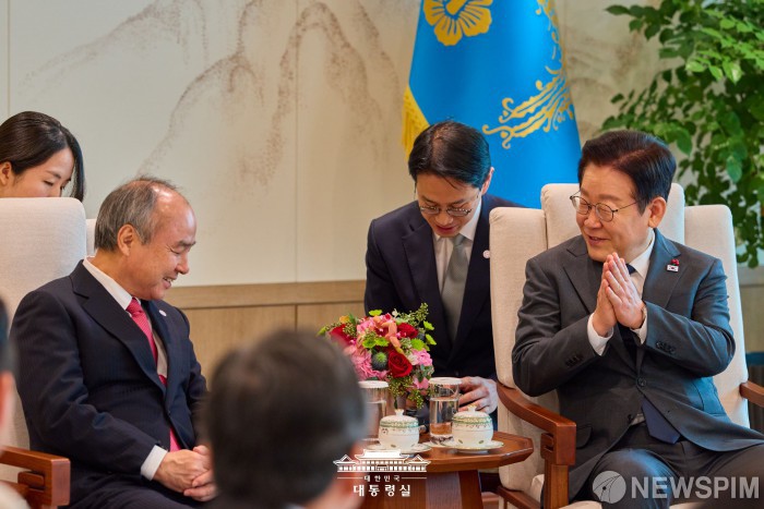 [서울=뉴스핌] 이재명 대통령이 지난 5일 서울 용산구 대통령실에서 손정의 소프트뱅크회장을 접견하고 있다. [사진=대통령실] 2025.12.06 photo@newspim.com
