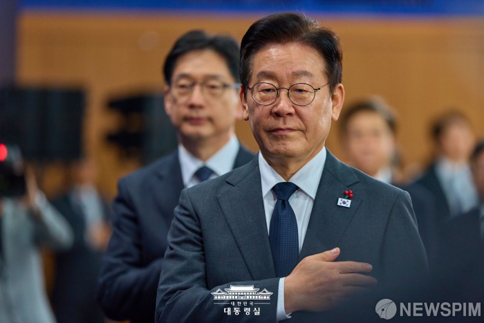 [서울=뉴스핌] 이재명 대통령이 지난 5일 충남 천안시 한국기술교육대학교에서 열린 '충남의 마음을 듣다' 타운홀 미팅에서 국민의례를 하고 있다. [사진=대통령실] 2025.12.06 photo@newspim.com