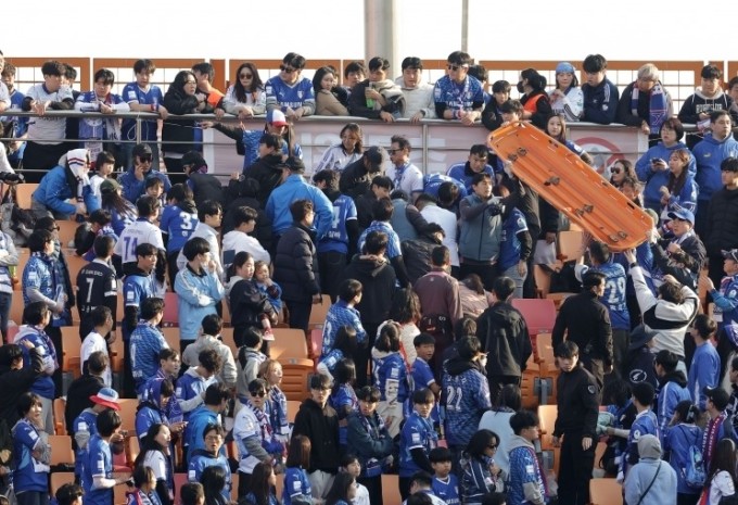 7일 제주월드컵경기장에서 열린 K리그 2025 승강 플레이오프 2차전 후반 17분 수원 원정석 관중 한 명 과호흡 증세로 쓰러져 경기가 잠시 중단됐다. [사진=한국프로축구연맹]