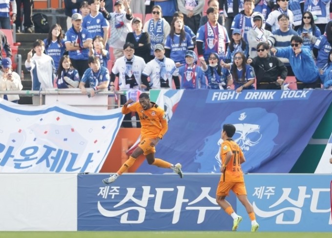 제주 이탈로가 7일 제주월드컵경기장에서 열린 K리그 2025 승강 플레이오프 2차전에서 추가골을 넣고 골 셀레브레이션을 하고 있다. [사진=한국프로축구연맹]