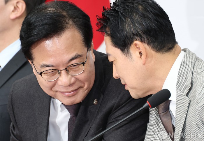 [서울=뉴스핌] 최지환 기자 = 장동혁 국민의힘 대표와 송언석 국민의힘 원내대표가 8일 오전 서울 여의도 국회에서 열린 최고위원회의에서 대화를 나누고 있다. 2025.12.08 choipix16@newspim.com