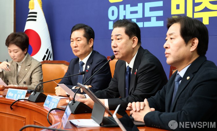 [서울=뉴스핌] 정일구 기자 = 김병기 더불어민주당 원내대표가 8일 오전 서울 여의도 국회에서 열린 최고위원회의에서 모두발언을 하고 있다. 2025.12.08 mironj19@newspim.com